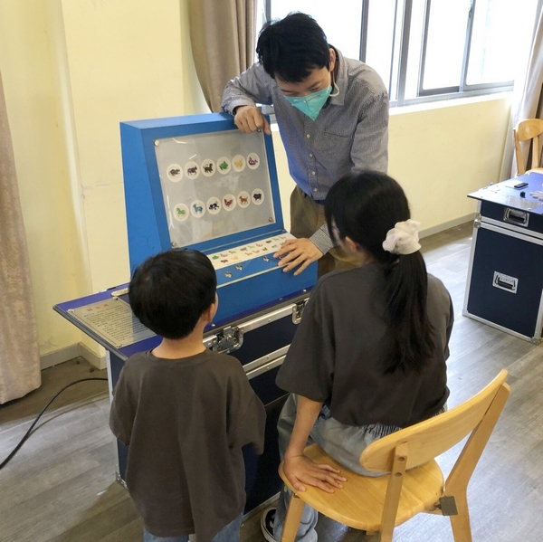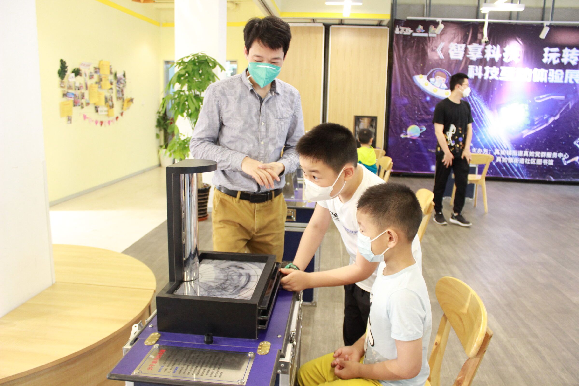“不要著急,咱們先看看旁邊的文字說明好不好?”工作人員帶著小朋友遵照儀器旁的文字說明一步步操作,直至儀器運轉,“魔法”閃現,小朋友直呼“太神奇了”!