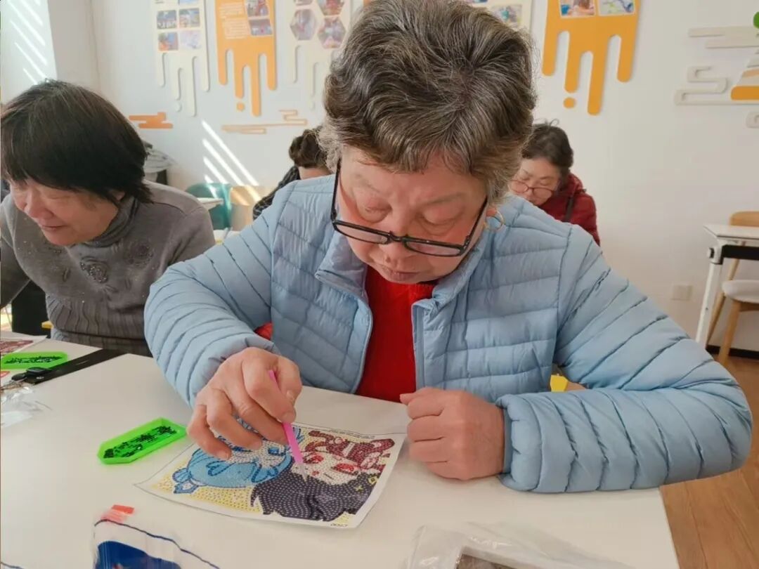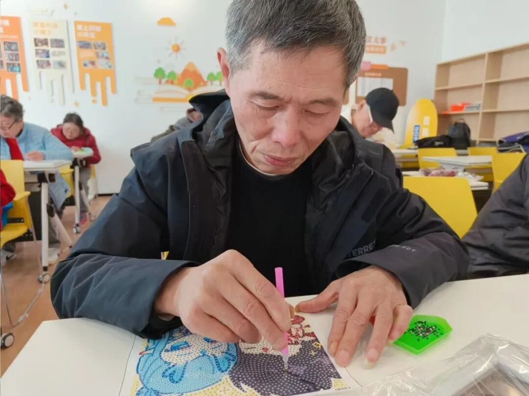 活動伊始,指導老師分發材料並細致講解技法。老人們聽得津津有味,眼神中透露出對新鮮事物的好奇,隨后,迫不及待地拿起工具,對照圖樣逐顆黏貼。馬師傅緊盯畫布,精准落下一顆彩鑽后笑道:“我以前從來沒接觸過這些,起初覺得難,沒想到上手之后發現很有意思。”其他老人也紛紛點頭表示贊同,切磋技巧、分享心得,現場笑語不斷。