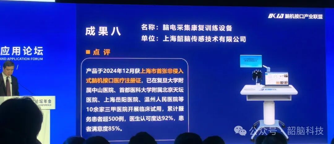 專家點評:“產品於2024年12月獲得上海市首張非侵入式腦機接口醫療注冊証,已在復旦大學附屬中山醫院、首都醫科大學附屬北京天壇醫院、上海岳陽醫院、溫州人民醫院等10余家三甲醫院開展臨床試用,累計服務患者超500例,醫生認可度達92%,患者滿意度85%。”