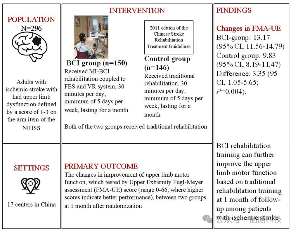 首都醫科大學附屬北京天壇醫院孟霞團隊領導了一項腦機接口臨床試驗,旨在探索腦機接口在缺血性腦卒中患者的上肢運動功能康復訓練中的有效性和安全性。該研究於2024年4月19日發表於Cell子刊Med上,該臨床研究顯示,腦機接口康復訓練可以在傳統康復訓練的基礎上進一步改善缺血性腦卒中患者的上肢運動功能。