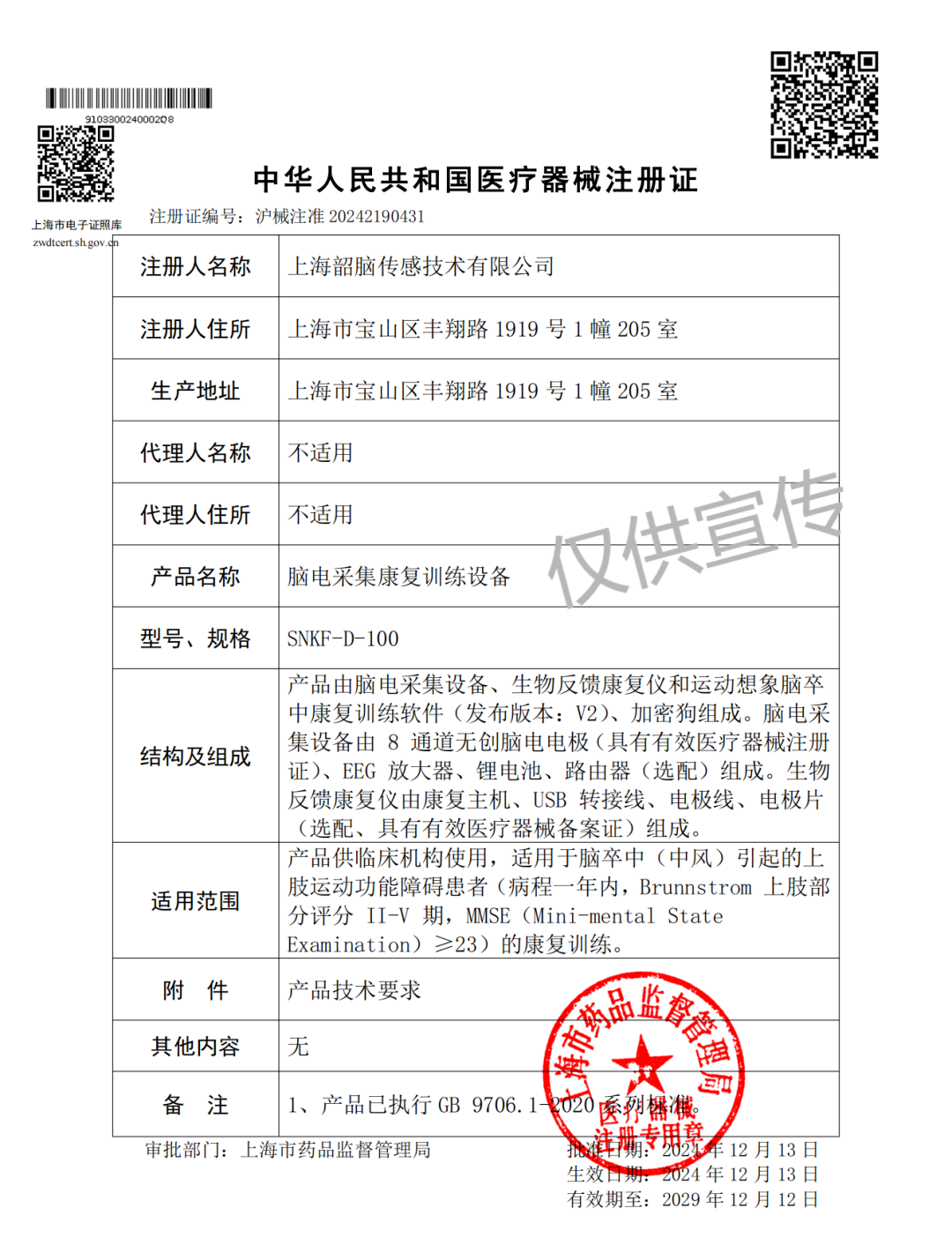 2024年12月13日,韶腦科技研發的“腦電採集康復訓練設備”(滬械注准20242190431)榮獲上海市首張非侵入式腦機接口醫療器械注冊証,這一歷史性成就不僅標志著國內腦機接口技術在醫療領域的重大飛躍,也為智能醫療的未來描繪了一幅光明的藍圖。此次獲得注冊証的產品,依托先進的運動想象腦機接口技術,將深度革新康復治療和神經疾病輔助領域,開啟醫療康復的新篇章。