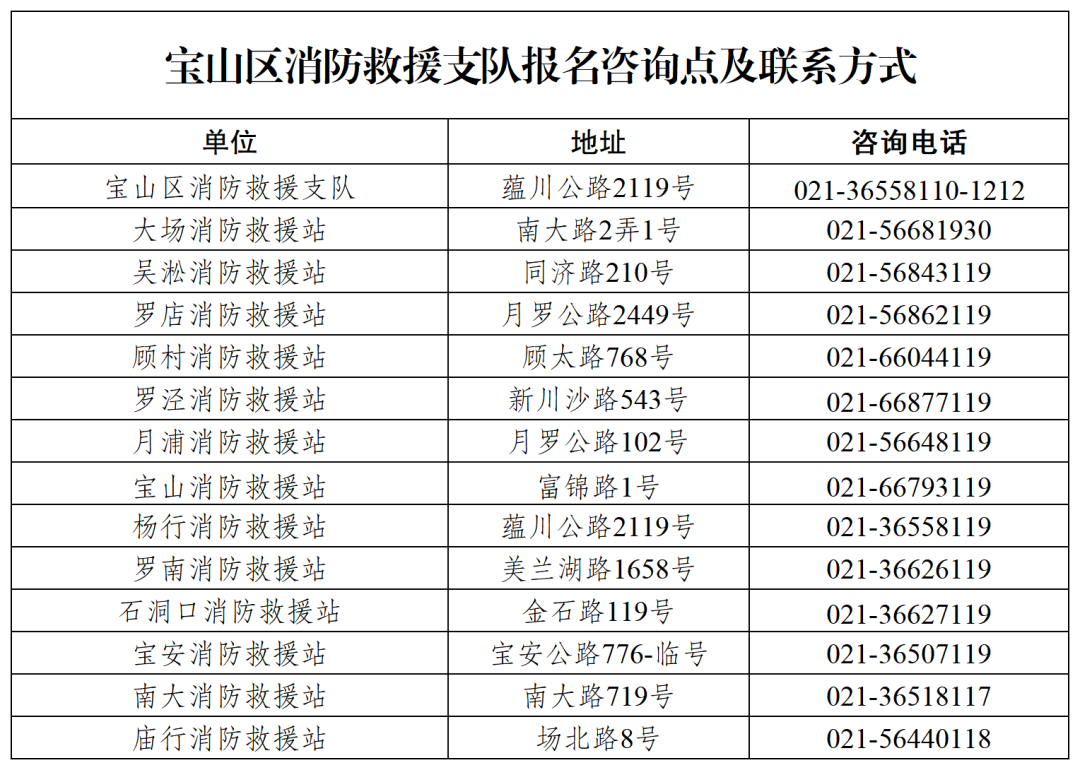 本次寶山消防面向社會公開招聘135名政府專職消防員的具體崗位、人數、資格條件等,詳見《上海市消防救援總隊政府專職消防員招聘簡章》。從4月11日起可通過上海市消防救援總隊招聘管理平台(http://zp.shxf-119.com)進行查詢。