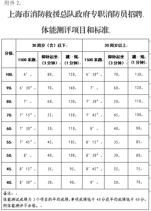 體能測試具體標准詳見《上海市消防救援總隊政府專職消防員招考體能測評項目和標准》。
