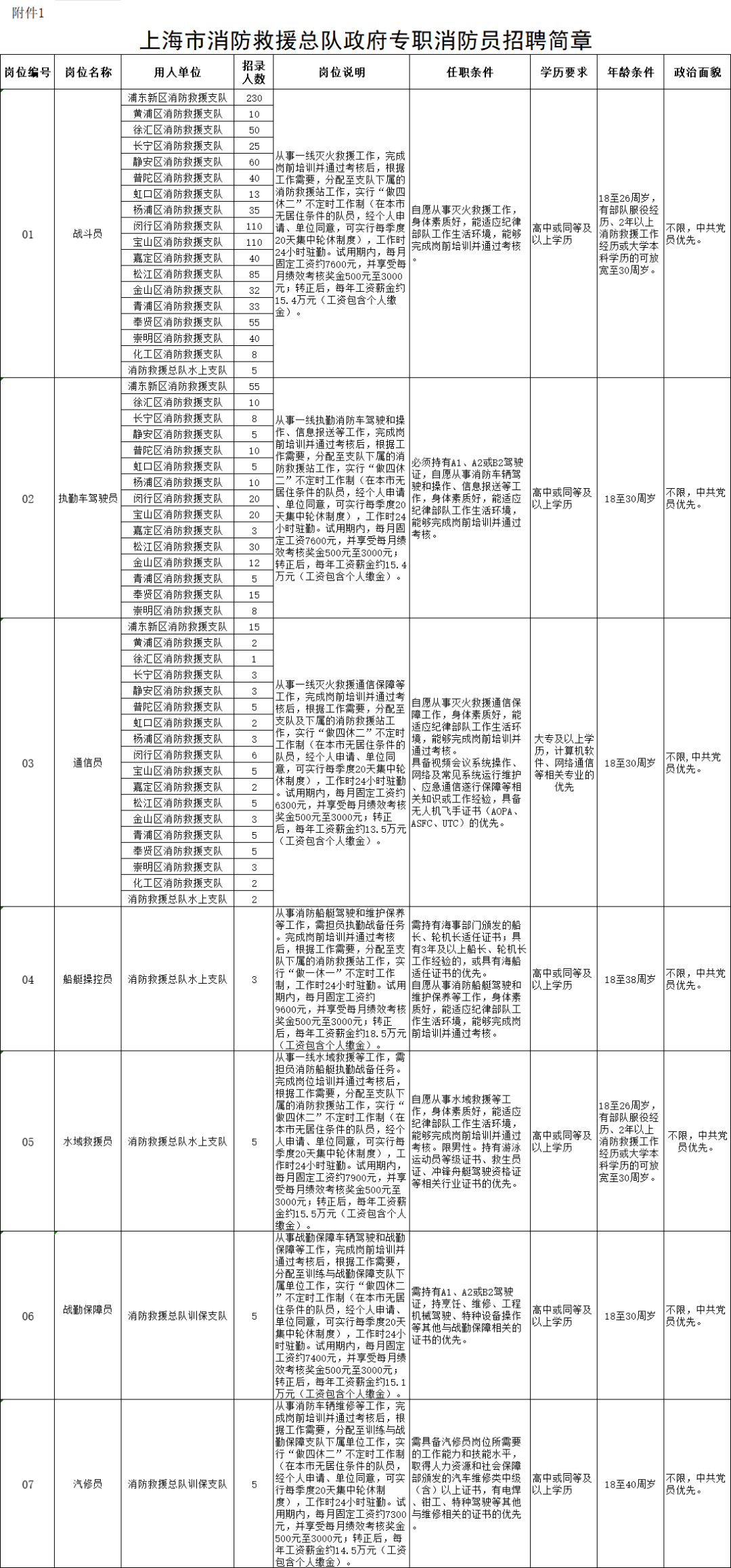 上海市消防救援總隊面向社會公開招聘1287名政府專職消防員。其中寶山區消防救援支隊招聘135名政府專職消防員(戰斗員110人、執勤車駕駛員20人、通信員5人)。