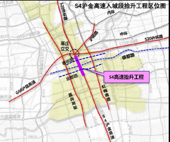 S4入城段(莘庄立交-金都路)抬升工程北起莘庄立交,南至金都路,全長約3.64公裡,採用“兩段式高架+地面道路”的總體方案,自莘庄立交接向南抬升跨越莘朱路、春申路后,為避讓高壓走廊在春申塘北側落地,過春申塘后抬升跨越銀都路、梅州路及金都路,接順金都路跨線橋。
