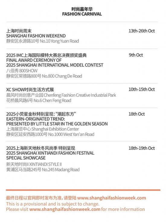 2025上海時尚嘉年華還將舉辦多項豐富活動,全城潮流地標同步點亮——前往八佰秀,見証IMC上海國際模特大賽總決賽的巔峰對決﹔在晨風時尚創意產業園,解鎖XCSHOW沉浸式時尚生活體驗﹔在上海展覽中心,欣賞小熒星帶來的“潮起東方”金秋特別呈現。