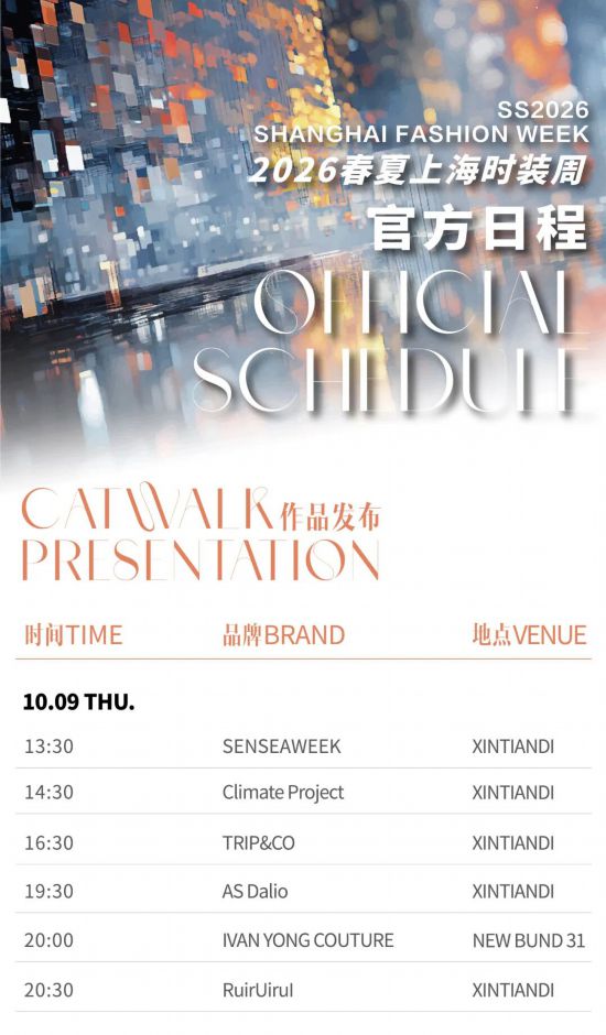 市商務委介紹,近日,2026春夏上海時裝周正式公布活動日程,將於10月9日盛大啟幕。作為今年“上海之夏”國際消費季十大標杆活動之一,本季時裝周以“拓界·再定義”為主題,融合科技、藝術、文化與可持續理念,打造一場可感知、可體驗、可分享的時尚盛事。詳見↓