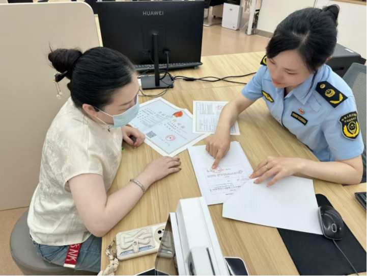 上海市市場監管局工作人員對企業辦事人員進行窗口指導。上海市市場監管局供圖