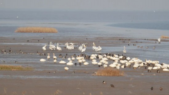 上海市綠化市容局介紹,當冬日的暖陽洒在崇明東灘無垠的蘆葦蕩上,這片長江口的“鳥類天堂”再次迎來遠方的客人。近日,保護區監測人員記錄到18隻國家一級保護野生動物、全球近危物種——卷羽鵜鶘。