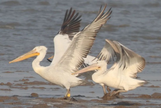 18隻卷羽鵜鶘飛抵崇明東灘!還帶著“身份証”