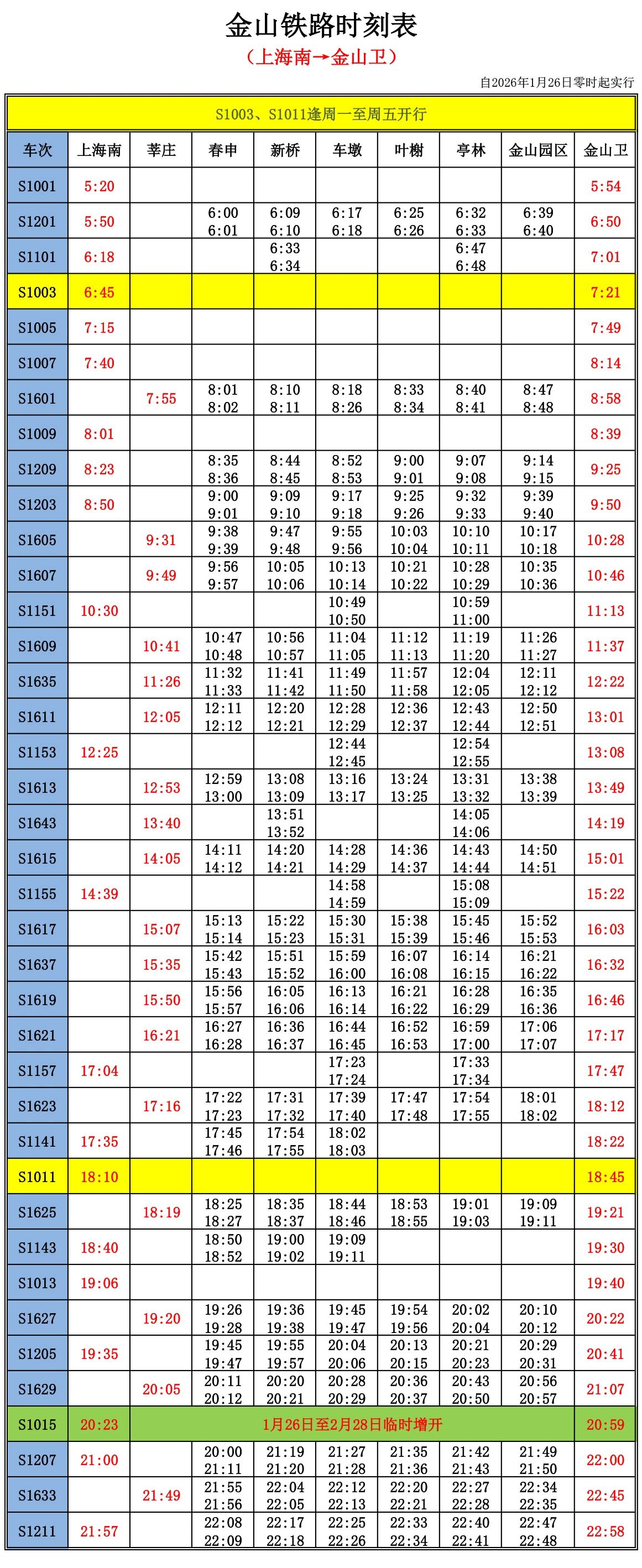 上海金山鐵路實行2026年春節期間列車開行方案