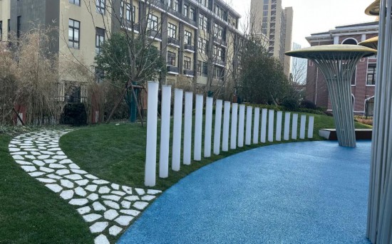 綠地中起伏舒展的陽光大草坪、錯落有致的喬灌植被組團,搭配彩葉灌木與觀賞草境,形成四季有景的生態基底﹔園內設置了以藍色為主色系的兒童游樂區,包含攀爬網、海盜船滑梯等設施﹔彩色健身步道串聯全園,既滿足通勤與運動需求,又以藍紅撞色線條強化了現代活力感。同時布局了林下休憩平台、階梯式觀景坐凳等節點,兼顧商務洽談、臨時休憩與小型活動需求,服務科創人群的日常工作與生活場景。