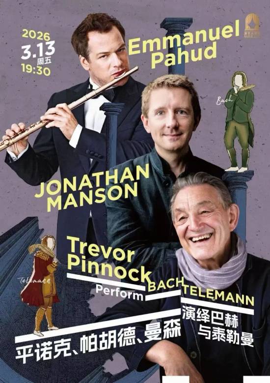 3月13日,羽管鍵琴巨匠特雷沃·平諾克將攜手柏林愛樂樂團長笛首席埃曼紐·帕胡德與維奧爾琴大師喬納森·曼森 ,以“天花板”級別的陣容,重現巴赫與泰勒曼的純淨原音。
