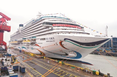 第二艘國產大型郵輪"愛達·花城號"在上海出塢