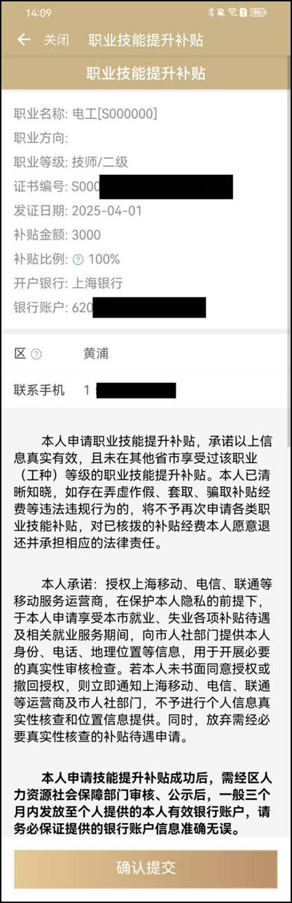 點擊需要申請的証書信息,確認補貼金額、補貼比例及個人銀行賬戶信息,如需修改銀行賬戶信息,可點擊【修改】按鈕維護銀行賬戶信息。
