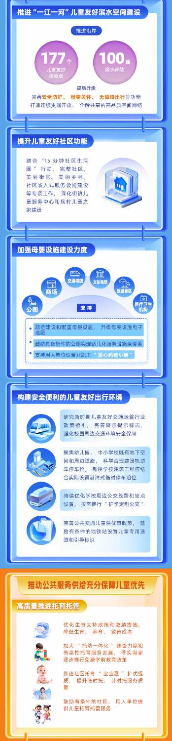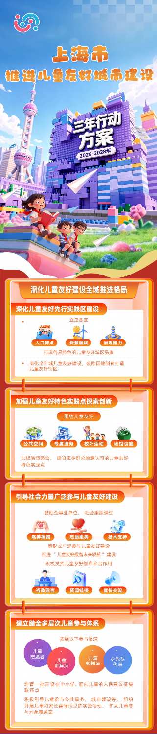 上海市發展改革委介紹,《上海市推進兒童友好城市建設三年行動方案(2026-2028 年)》近日發布。新一輪行動方案強調下一步要深化兒童友好建設全域推進格局,將兒童優先原則落實到公共政策制定、公共空間和設施建設、公共服務供給等方面,筑牢安全底線,守護廣大兒童健康安全成長。來看一圖讀懂↓