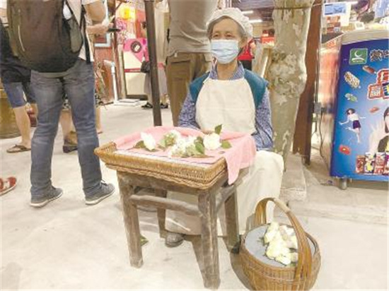 卖白兰花的“阿婆”其实是一尊蜡像 (记者 谢竲 摄)
