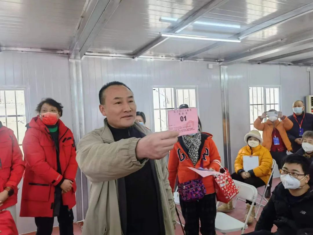 上午9点半,活动准时开始,居民们按照摸号顺序号,逐一上台摸取选房号。现场秩序井然,居民们热情高涨,有的居民更是戴上了红围巾、红帽子,想给自己讨个好兆头。