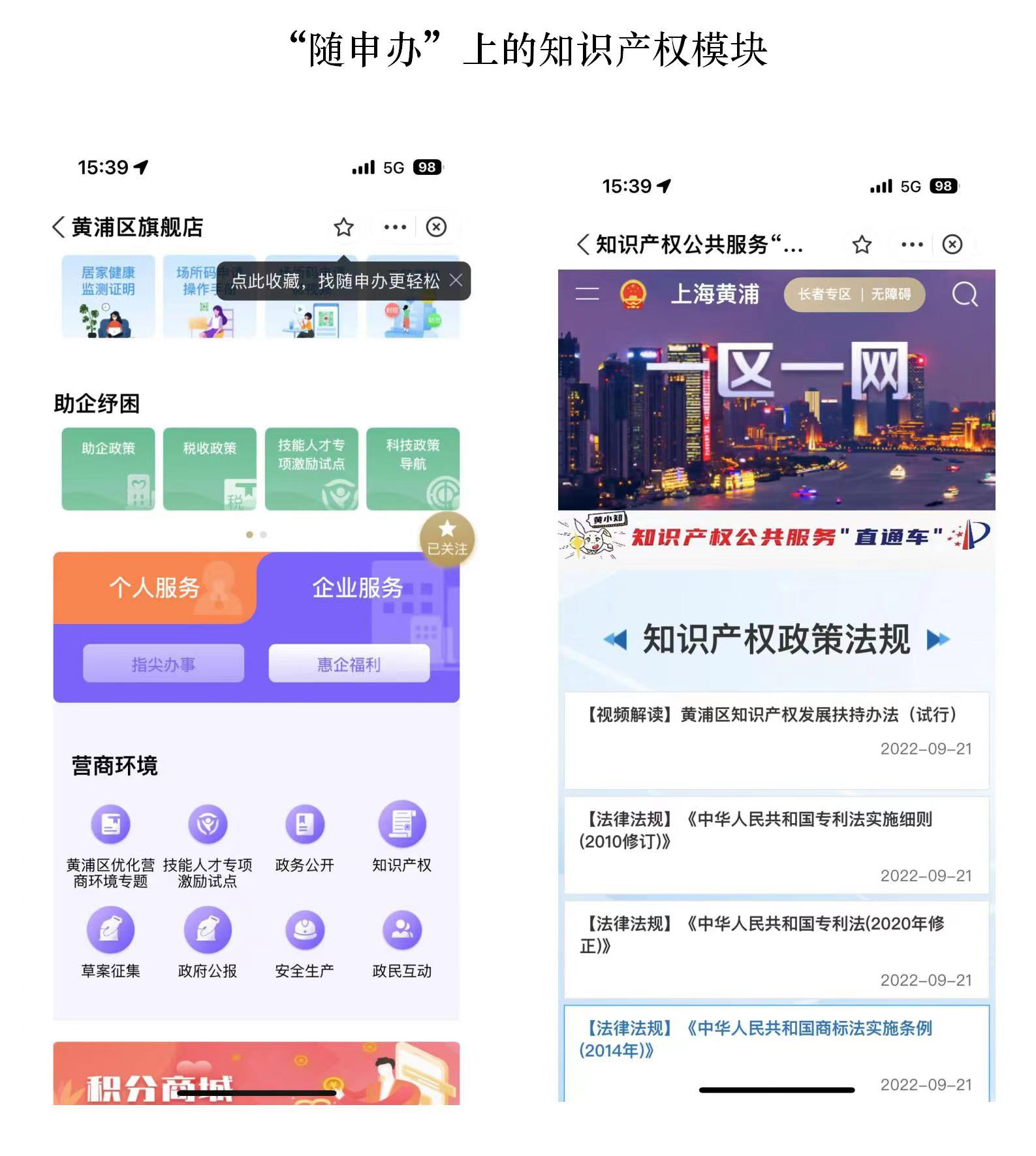 “随申办”APP“黄浦旗舰店”内知识产权服务模块