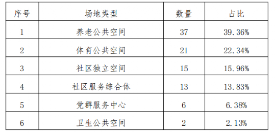 据统计,全市长者运动健康之家项目以嵌入社区公共服务场所为主,包括社区养老、体育等公共空间。其中,建在养老公共空间(如社区综合为老服务中心)有37家,占比39.36%;建在体育公共空间(如社区市民健身中心、文体活动中心等)有 21家,占比22.34%。
