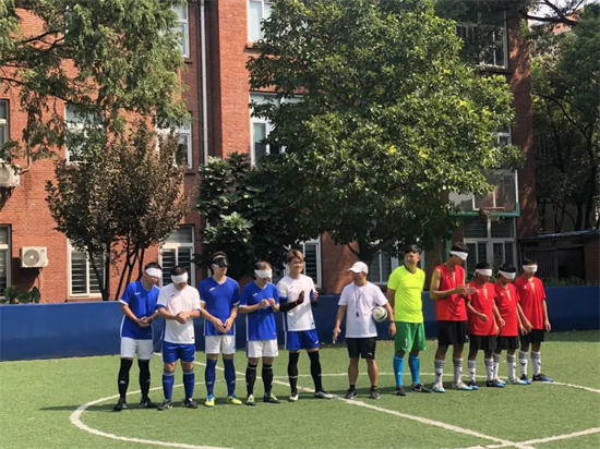 红色队服球员来自新疆盲足球队,蓝白队服球员来自上海市盲童学校
