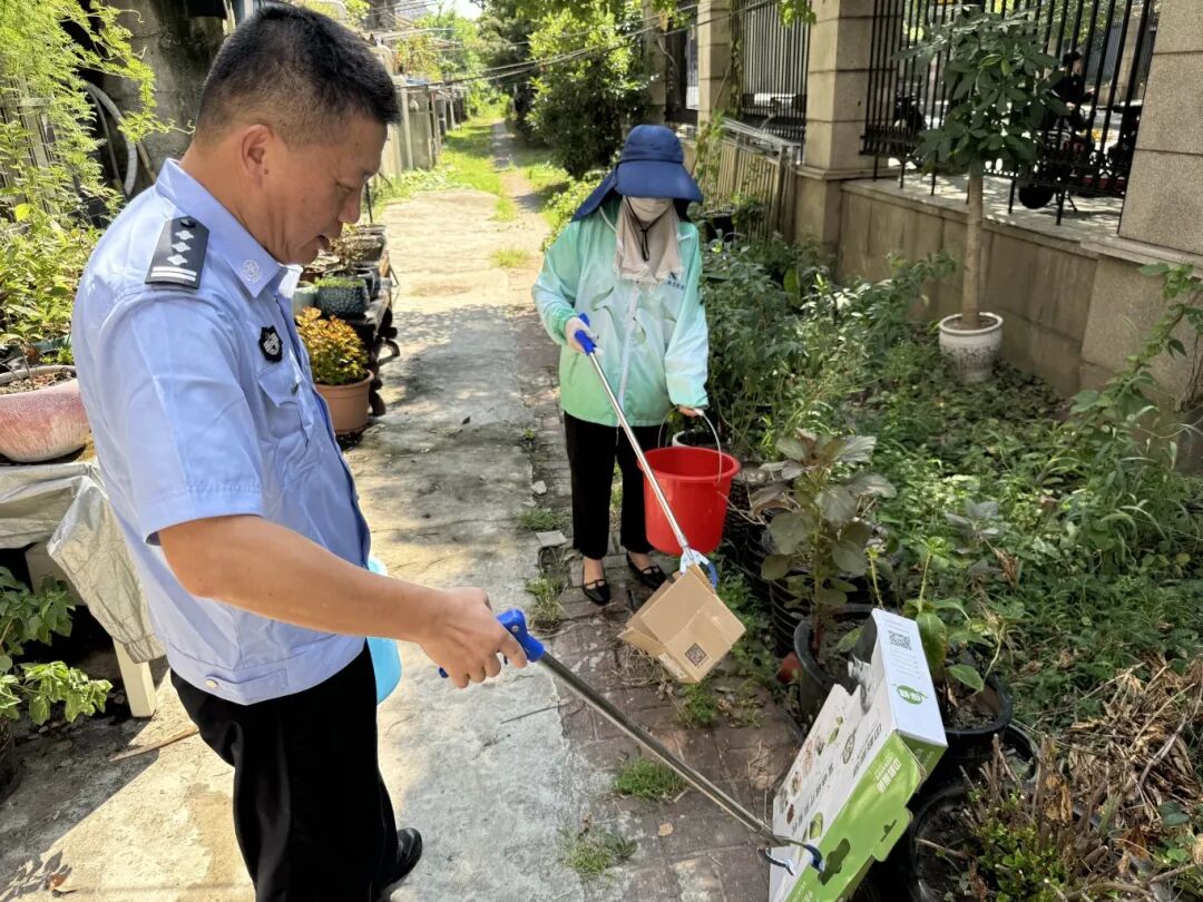 淞南八村居委组织社区工作人员、物业工作人员针对小区内存在的共享单车停放不规范、垃圾分类不规范等现象进行集中整治,对在公共区域乱堆物的居民进行思想教育,要求落实整改,并由物业后续喷洒药水,避免蚊虫孳生。同宣传、同监督,同示范、同行动,让垃圾分类及环境整治工作更全面、更精细。