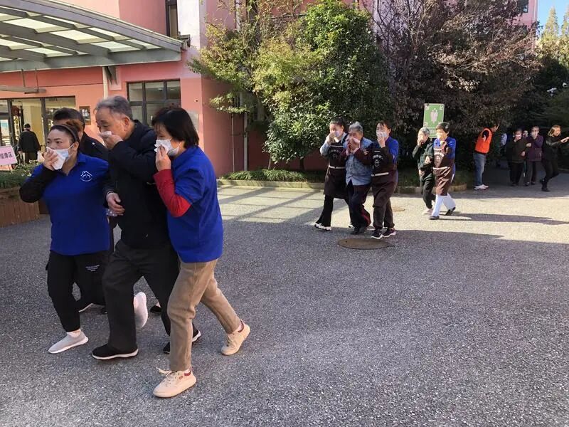 随着演练开始,紧急疏散广播不停发出提醒,各部门员工闻声而动,立即进入“战斗”状态,全院启动消防联动模式。工作人员一边安抚着惊慌失措的老人,一边用温和且坚定的语言引导他们如何正确进行逃生。他们迅速拿出早已准备好的湿毛巾,紧紧捂住口鼻,以免吸入有毒烟雾,同时快速有序地从消防疏散通道撤离。到达疏散集合点后,工作人员清点人数,确保每一位老人都已安全撤离。