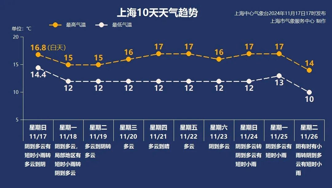 深秋的气息已经十分浓重。明天上海虽然转晴,但仍被寒冷“硬控”,最高温保持在15℃。预报显示,本周上海气温难再回到“2”字头,最高温基本保持在16℃上下。新一轮冷空气正在候场,紧随在本轮冷空气之后,即将在11月24日前后影响我国,预计到26日,上海最高温有望再度下探。