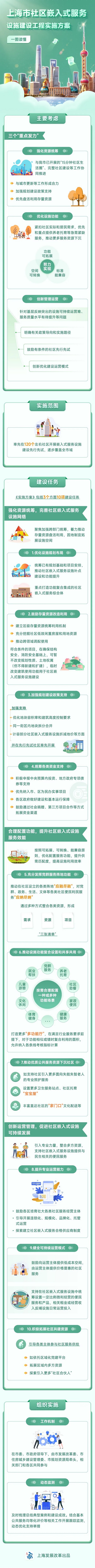 《实施方案》围绕强化资源统筹,完善社区嵌入式服务设施网络;合理配置功能,提升社区嵌入式设施服务效能;创新运营管理,促进社区嵌入式设施可持续发展等三个方面10项建设任务,并提出率先在120个左右社区开展先行先试。来看市发改委带来的“一图读懂”↓