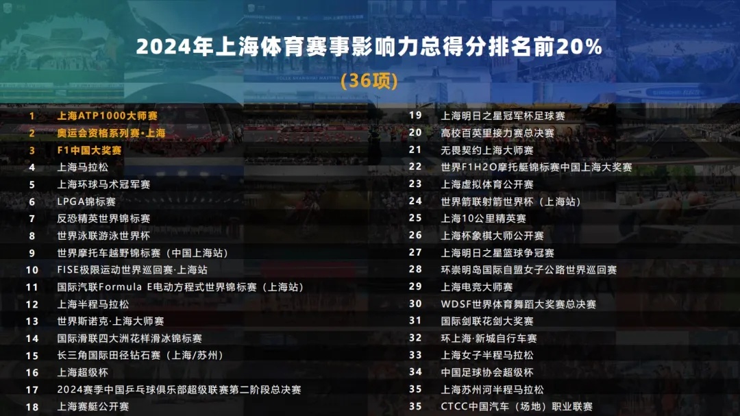 会上总结了2024年上海体育赛事高质量发展的两方面关键词:一是与城市同频共振的赛事体系是赛事经济高质量发展的关键支撑。一方面,国际顶级赛事不断丰富,发挥引领带动作用。2024年,上海在继续举办ATP1000大师赛、F1中国大奖赛、上海环球马术冠军赛等国际赛事的基础上,积极与国际体育组织对接,推动奥运会资格系列赛·上海、国际滑联四大洲花样滑冰锦标赛、世界泳联游泳世界杯等顶尖赛事顺利落“沪”,形成了多层次的国际顶级赛事发展格局。另一方面,自主品牌赛事体系成型,彰显城市内涵特质。伴随上海帆船公开赛、上海明日之星排球争霸赛和环上海·新城自行车赛等赛事在2024年的成功举办,标志着“3+3+3+X”自主品牌赛事矩阵初具规模。其中上海马拉松、上海赛艇公开赛、上海帆船公开赛“三上”赛事共带来直接经济影响9.62亿元,拉动效应26.62亿元。