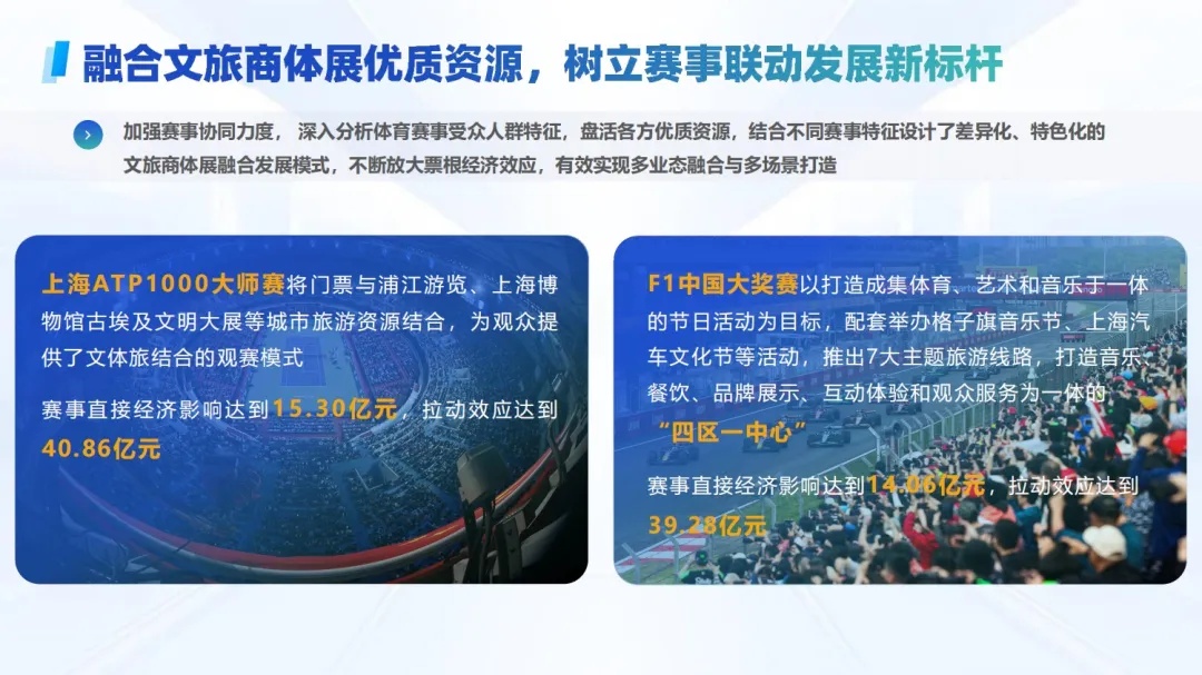 2024年上海依托体育赛事加快推动文旅商体展联动发展呈现出三大亮点。文旅商体展融合是做强赛事经济的重要引擎。2024年,上海充分考虑城市气质、产业优势、资源禀赋特色,通过导入文旅商体展优质资源实现对赛事消费动线的重塑,让“因为一场赛奔赴一座城”成为更多人的生活方式。统计显示,上海全年围绕体育赛事举办文旅商体展联动活动近200项,日均消费总额超过1000万元的赛事达到48项,占全部赛事比重达27%。F1中国大奖赛和上海ATP1000大师赛两项赛事分别吸引20万和22万人次到场观赛,赛事对“吃住行游购娱”六要素的拉动效应均超过15亿元;奥运会资格系列赛·上海创造了“观赛+深度体验”的融合发展新模式,将赛事打造成为城市体育派对,赛事吸引4.5万余名观众,直接经济影响6.43亿元,拉动效应14.02亿元。上海马拉松与上海体博会形成“顶级赛事+高端会展”的双向赋能,“以赛促展”“以展促产”,2024年上海体博会直接经济影响达7679.84万元,拉动效应达1.74亿元。