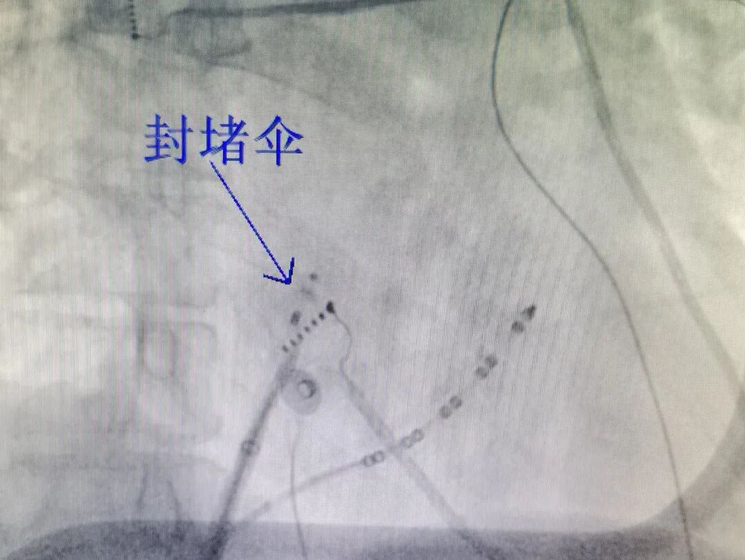 在中山医院专家的悉心指导下,吴淞中心医院心血管内科主任施鸿毓与主治医师张振洲密切配合、精准定位,在封堵伞后下缘外侧成功完成了房间隔穿刺。