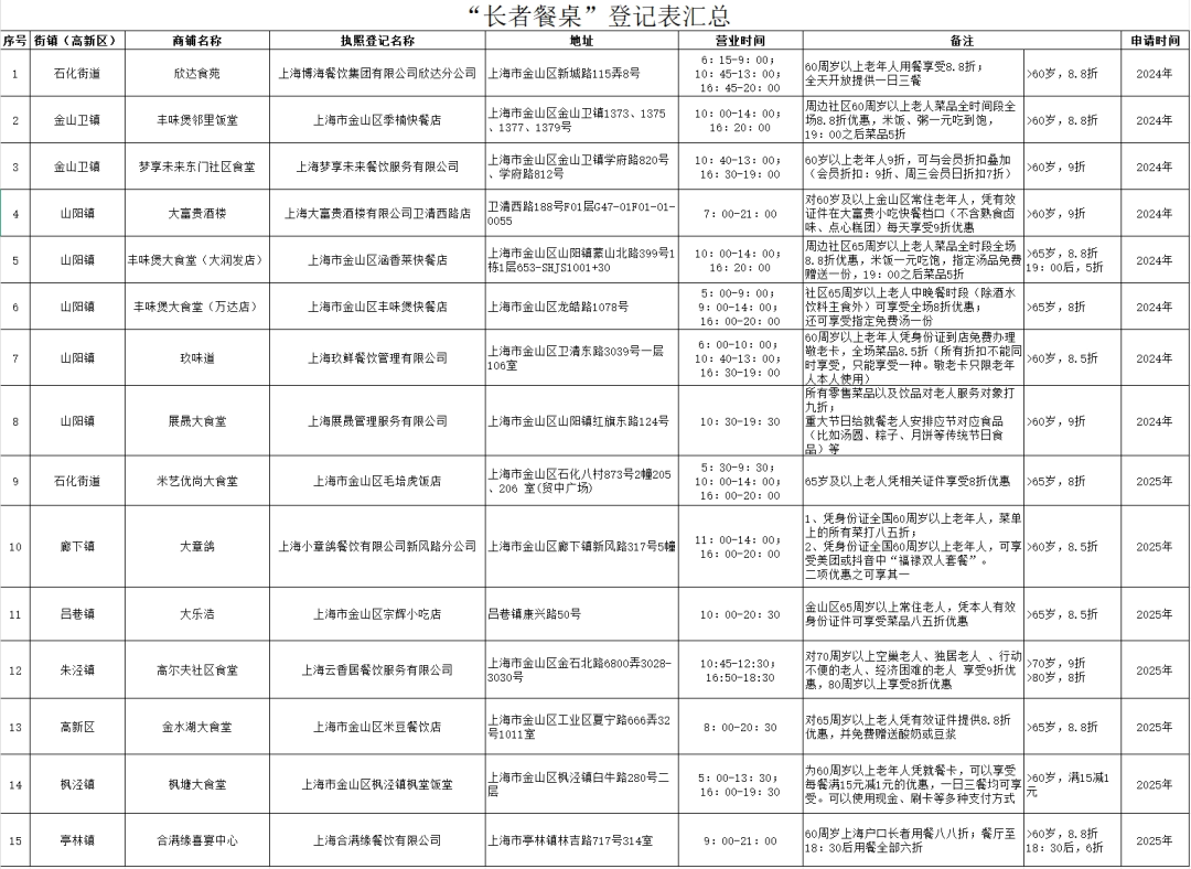 优惠:金山区65周岁以上常住老人,凭本人有效身份证件,就餐可享受菜品8.5折优惠。