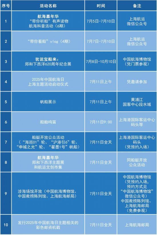 上海市交通委介绍,“中国航海日”(7月11日)是由政府主导、全民参与的全国性法定活动日。2025年是中国航海日设立20周年,也是郑和下西洋620周年,上海将举行相关主题活动以及船艇开放、帆船展示、航海嘉年华、涉海文化场馆免费开放等丰富多彩的公众活动,弘扬航海精神、传承航海文化,加快建设上海国际航运中心,服务交通强国、海洋强国战略实施。详见↓