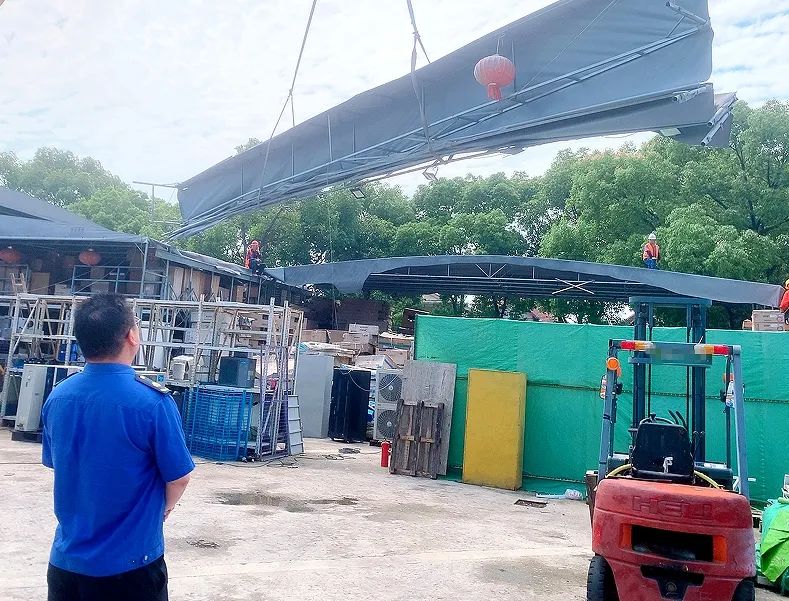 “新效路附近有厂房违建,请立即派人到现场处理。”就在不久前,执法队在日常巡查中发现,新效路某厂房过道上搭建出了4组伸缩雨棚。该违建雨棚高约12米,采用钢结构框架搭配滑轮轨道设计,因长期暴露在外,缺乏维护保养,雨棚的滑轮出现锈蚀现象。执法人员第一时间约谈企业负责人,明确告知其违法搭建可能面临的法律后果及该处违建存在的安全隐患。经过耐心细致的沟通与普法,负责人答应配合拆除。安全起见,执法队还协助企业提前制定详细的拆除方案,调配大型机械,安排专业施工队伍,最终成功拆除了这处面积约为3050平方米的大型高空伸缩雨棚。
