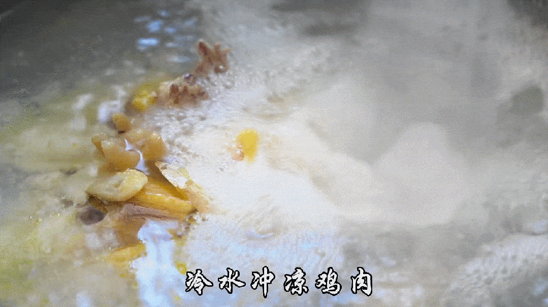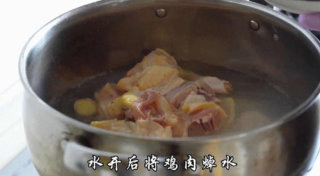 2.锅内倒水,水开后鸡肉焯水,加入黑胡椒粉、葱、姜、料酒去腥