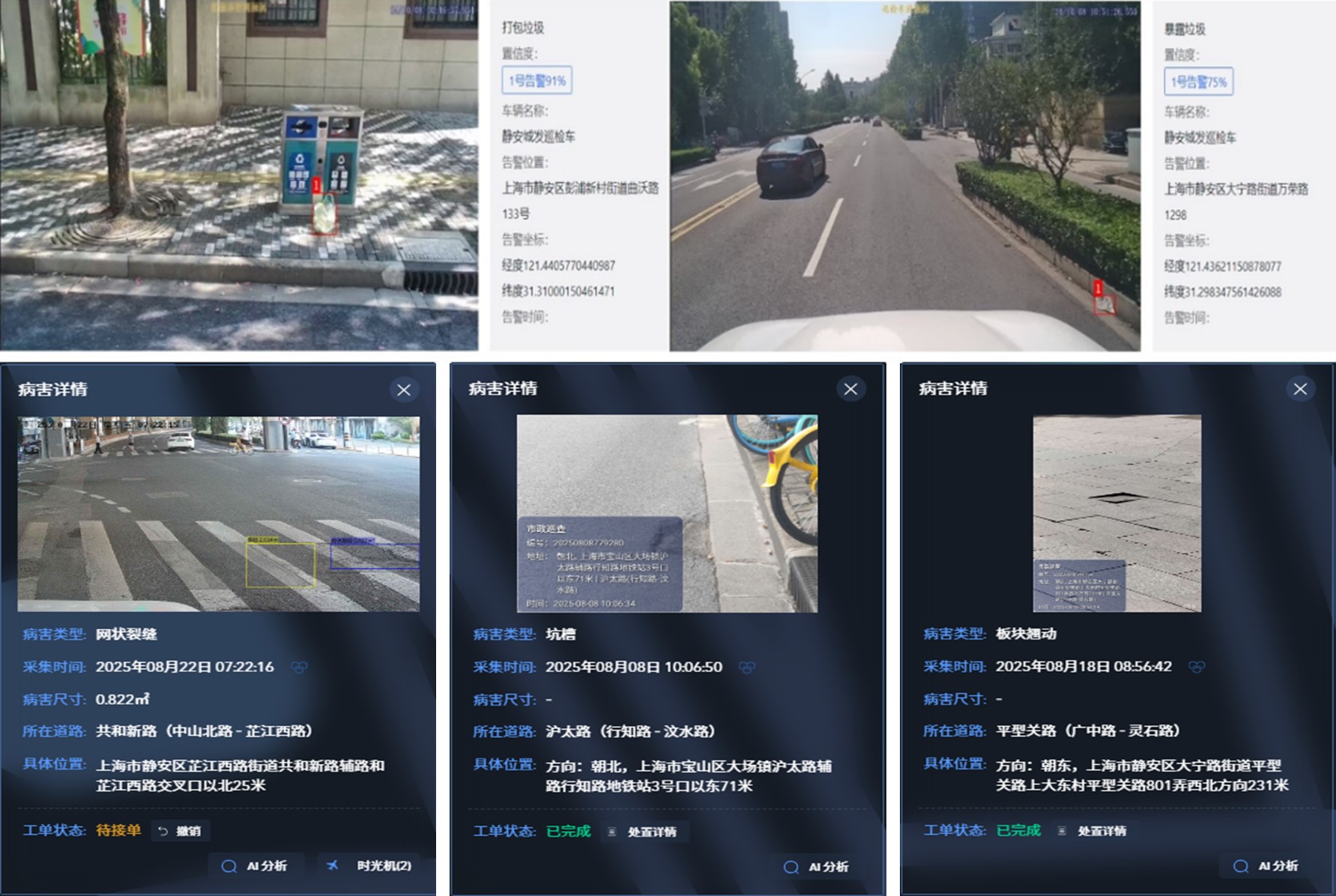 这位“智能体检员”的工作范围可不小,它跑遍了静安区14个街镇的284条道路、1299个路段。无论是路上的暴露垃圾、打包好的垃圾,还是路面的坑槽、裂缝,甚至是井盖没盖好、栏杆坏了这些细节,都能被精准“看”到。经过实际检验,它的识别准确率超过90%,真正做到了对道路问题的精准“把脉”。
