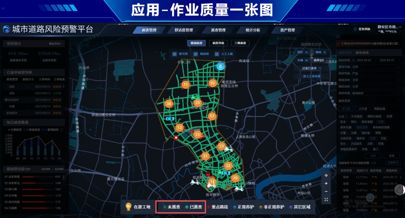 基于静安区路况条件特点,一辆巡检车一天8小时巡检里程 60—70公里,工作量相当于10-12名人工巡检员。2025年第二季度,3辆巡查车累计巡查16032公里,推送环卫案件8297件、市政病害7263件。环卫业务问题从发现到处置归档闭环只要20分钟,市政病害发现能力和处置修复能力也都得到了双重提升。