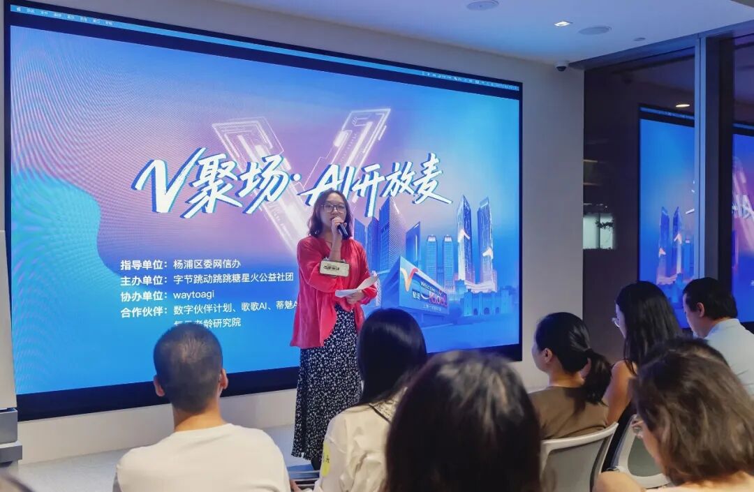 启动仪式由V聚场·AI开放麦活动负责人、抖音集团赵倩主持。字节跳动跳跳糖星火公益社团代表妮萍、WaytoAGI商业负责人庄庄,以及分享嘉宾瓦叔、方小艾等共同启动“V聚场·AI开放麦”系列公益活动。