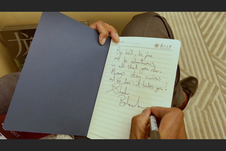 尚卡尔在采访现场给复旦学生题词。胡佳妮摄。