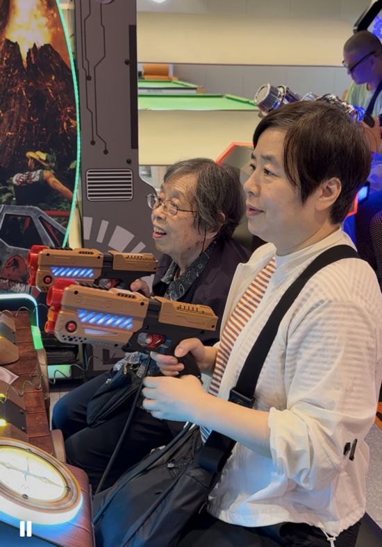 记者还惊喜看到一位正投入打枪游戏的86岁老奶奶,女儿陆女士说:“带妈妈来打电玩,是希望她在娱乐中锻炼手脑协调能力。”这已是母女俩第三次前来,老奶奶每次都能尽兴而归。