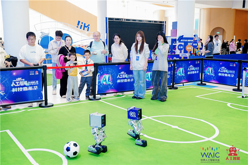 其中,创新创业展区是本届大学赛项的10强队伍成果展示。参赛团队纷纷化身“科技推荐官”,将高含金量的项目通过视频、互动演示等形式呈现。互动体验展区,则包含了各类趣味性的AI体验活动,如机器人足球、模拟飞行体验、AI造物趣桌等,将生成式人工智能融入体验中,让参与者感知“未来生活”的种种可能。