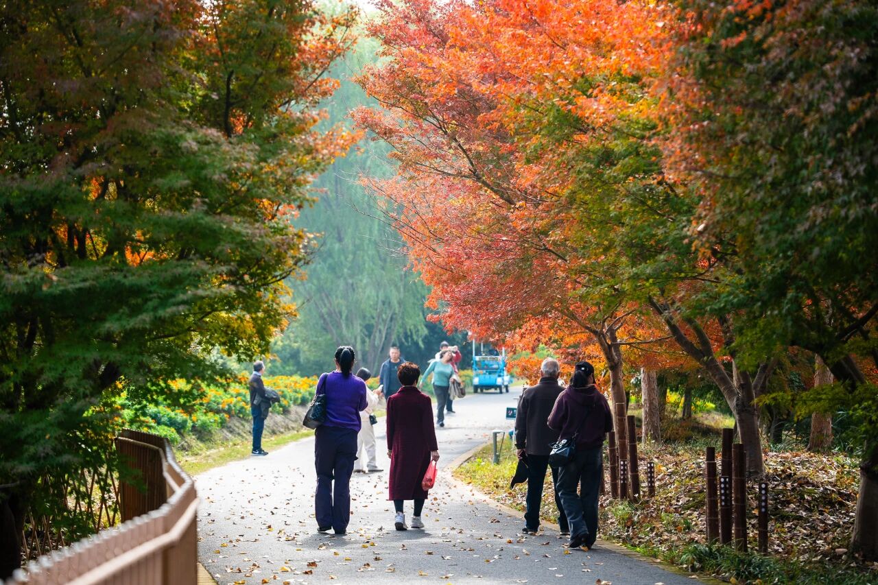 眼下,花开海上生态园内的秋色叶树种逐渐进入变色期。枫树、地肤、细叶芒等各类观赏性植物色彩交织,勾勒出层次丰富的深秋画卷。