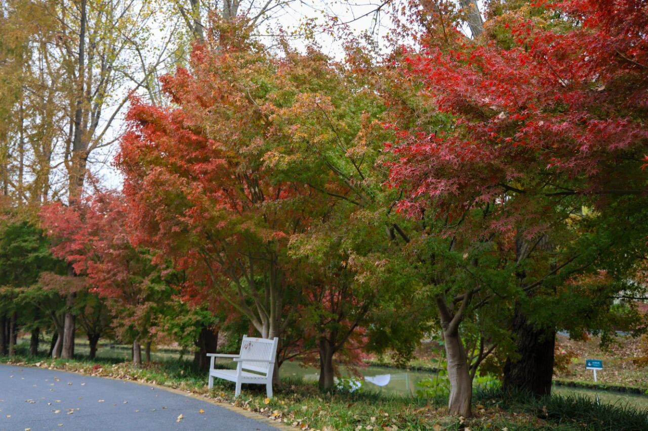 沿着生态园内秋景园的步道缓步前行,两侧枫树引人注目,红、黄、绿三色叶片在枝头交织,色彩过渡自然,宛如大自然打翻了调色盘,构成一幅斑斓多彩的秋景图。临水而植的红枫,身影倒映在水面之上,风拂过树梢,叶片簌簌飘落,落在肩头、水面,营造出静谧雅致的氛围,不少市民驻足于此,用镜头定格这份秋日浪漫。