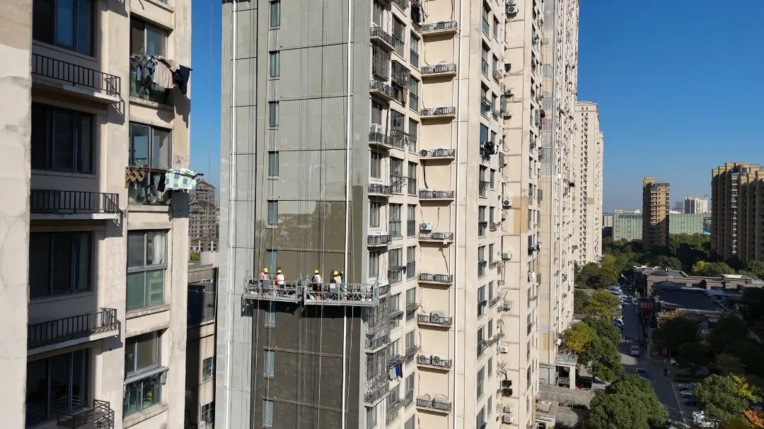 项目相关负责人周骞介绍说:“现阶段主要进行北立面与西立面的耐碱网格布铺设工作,并在十层以上区域大面积加装固定锚栓,后续将依次开展多道涂刷工序。北立面与西立面预计于今年12月修复完成;随后将启动南立面与东立面的维修施工,整体工程预计于明年上半年全部完成。”