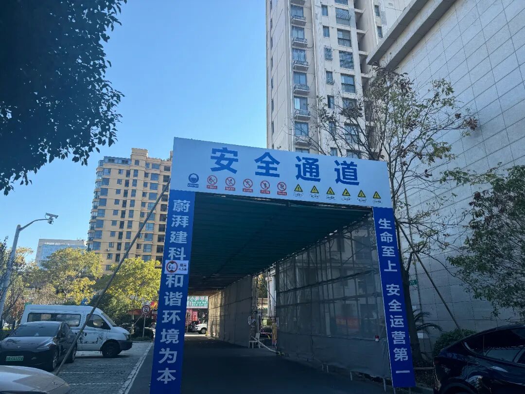 为最大限度减少施工对居民生活的影响,山阳镇相关部门、居委会、业委会、物业与施工方通过实地勘察与多方协调,共同制定了一套详细的安全施工方案,严格落实各项防护措施。包括在楼栋外设置防护棚、放置警示标识,安排专职安全员开展动态巡查,并设置专用安全通道,全力保障居民“脚下”与“头顶”的安全。