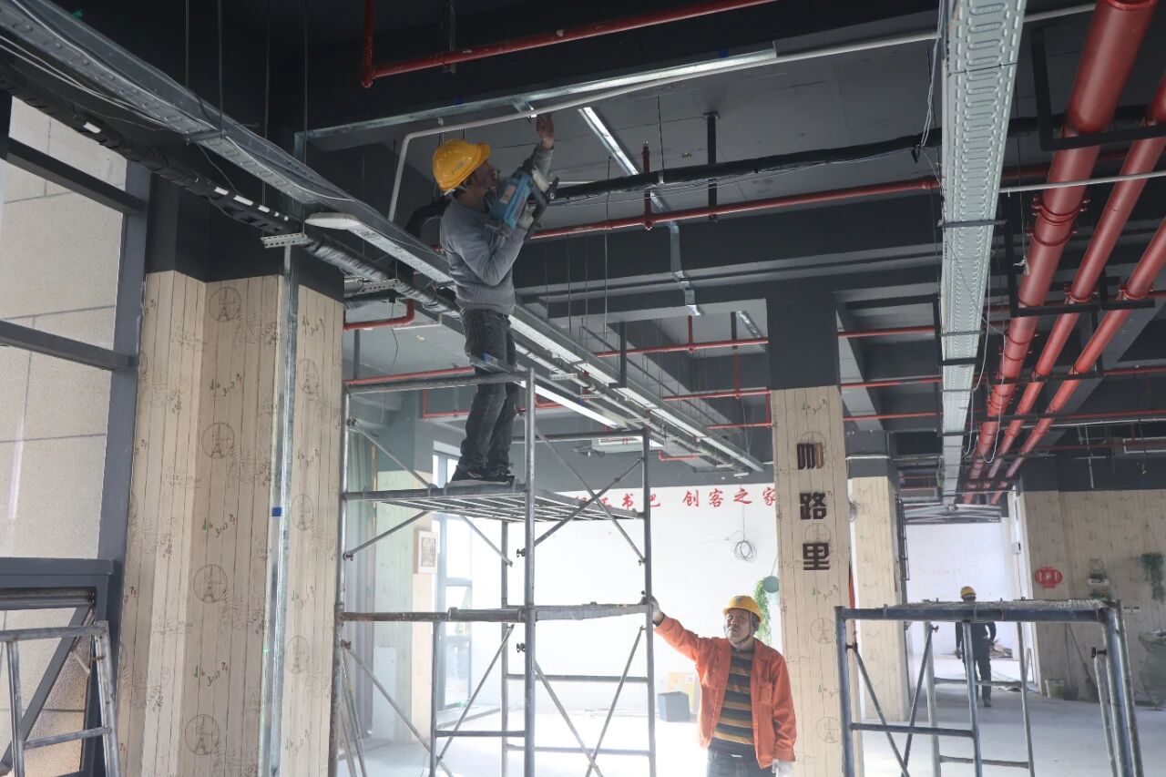 在施工现场,工作人员们正在给房屋一层做墙体改造、线路预埋等作业。“此次改造工程主要包括室内1-3层改造修缮、室外停车场改造、南侧庭院改造等,施工总面积约5000平方米。”施工方负责人徐君表示,一层有路演厅、接待室等园区共享空间,西侧正被改造成规模注册企业的办公空间,“以后企业入驻,不用再额外花时间拆改,拎包就能入驻办公。”