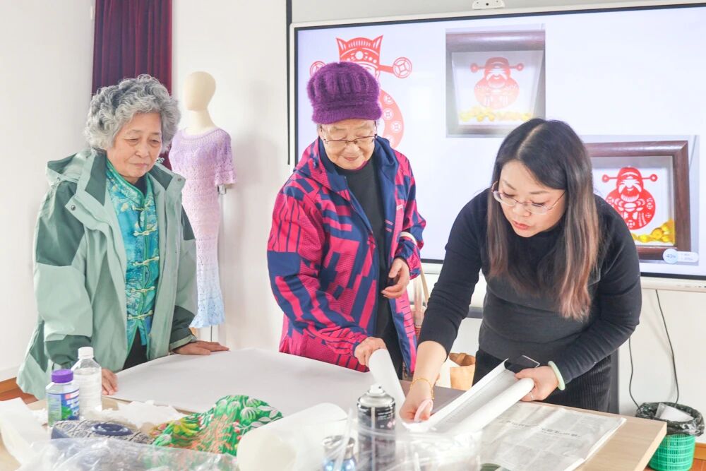 开课以来,连续多个学期报名剪纸的学员不在少数,他们从基础的剪纸符号学起,再到刻制花鸟、风景等大大小小的作品,不断磨练剪刻功底。课堂还融入立体剪纸、套色剪纸等表现方法,腰佩、冰箱贴等文创形式,展现剪纸的千变万化,激发老年人的学习兴趣。