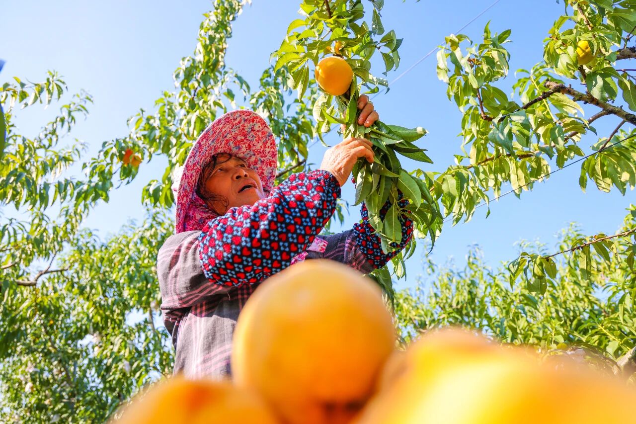 孙希洲的种桃秘诀,全在“匠心”二字。每年盛夏,拳头大的黄桃挂满枝头,果皮泛着诱人的金黄色,绒毛细腻柔软,轻轻一撕就能露出饱满多汁的果肉,咬下去的瞬间,清甜的汁水在舌尖爆开,甜度恰到好处,没有一丝酸涩,这是阳光、土壤与老孙用心交织的味道。