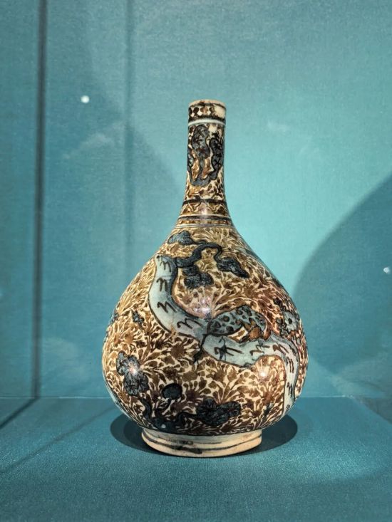 铭诗盘、兽斗纹圆形饰板等彩陶器不仅具有实用价值,更承载了文学母题和诗歌意象,堪称“会说话的艺术品”;动植物纹瓶等彰显出华丽的“拉斯特彩”陶瓷装饰技术,同时体现出中国青花瓷的纹样如何融入萨法维艺术语言;王室与贵族的肖像油画展现了本土艺术家吸收欧洲绘画技术后的进化与突破;这一时期广泛流行的珐琅工艺也被运用至当地特色水烟壶的制作当中。